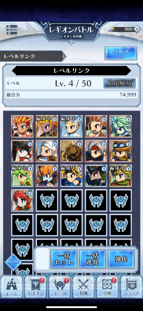 通常のゲームでは、1体ずつ選んで合成・レベル上昇、といった流れですが、レベルリンク機能があれば、複数のキャラを一斉にレベル上げが可能なんです!
