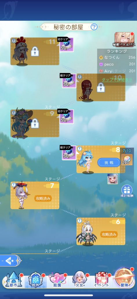 「秘密の部屋」は、階段のように、1ステージずつ進んでいく常駐のコンテンツです。